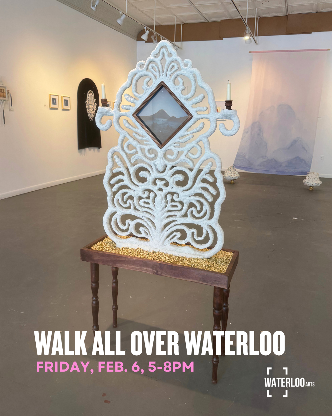Join us for February’s Walk All Over Waterloo on Friday, February 6th from 5-8pm! If you haven’t seen our current exhibitions, here’s the perfect chance. We’ll be offering Mini-Tours of the Dana Lynn Harper Exhibition “Rituals of Return” on every half hour!